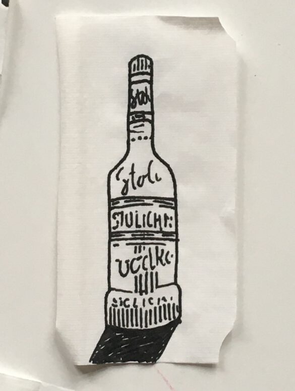 To the extent it’s Gately’s place to diagnose anybody else as an alcoholic, his mom was pretty definitely an alcoholic. She drank Stolichnaya vodka in front of the TV. They weren’t cable-ready, for reasons of $. She drank little thin glasses with cut-up bits of carrot and pepper that she’d drop into the vodka.