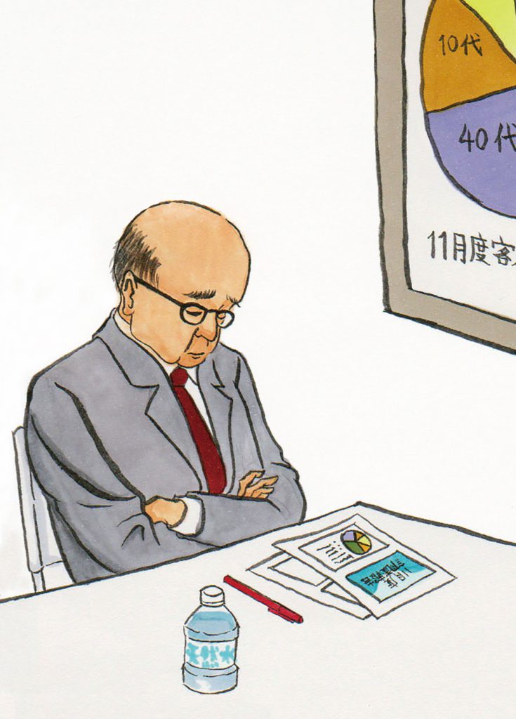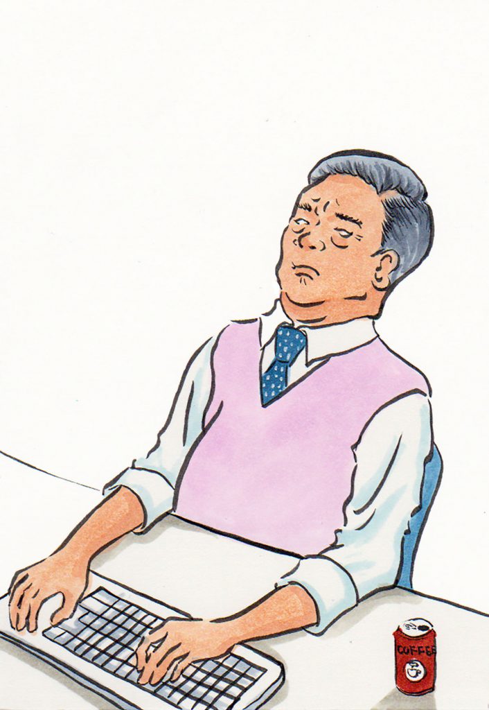 Genau das hat die Zeichnerin Oguro in ihrer Zine-Reihe eingefangen: Ältere Männer beim Dösen in der Bahn und am Arbeitsplatz. „Irgendwie fand ich das unfair, dass vor allem Männer immer schlafen, auch bei der Arbeit. Ich habe mich dann entschlossen, kreativ damit umzugehen“, sagt die Grafikerin.