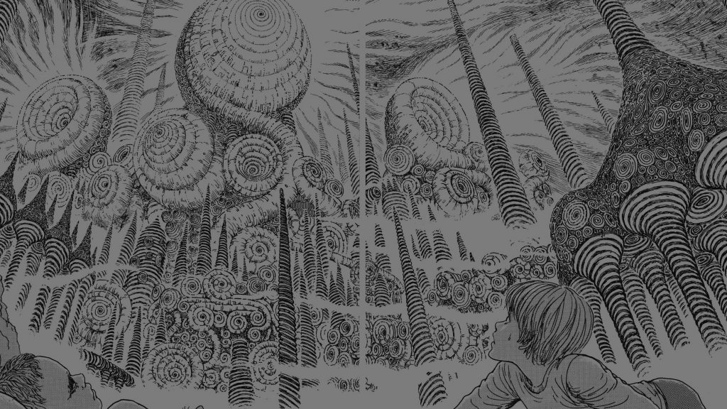 Auch Uzumaki (japanisch für Vortex), das im Carlsen-Verlag seit dieser Woche als neues Hardcover in deutscher Sprache verfügbar ist, behandelt metaphysische Fragen. Der Horror zieht in eine kleine japanische Küstenstadt ein. Spiralen sind auf einmal überall. Sie steigen als Rauch aus Krematorien auf, der nicht abziehen will, und treiben die Bevölkerung in den Wahnsinn. Die ist dazu verdammt, ihr Schicksal passiv über sich kommen zu lassen. Die Stadt wird im Wortsinn von einem Strudel erfasst, der die Realität wie einen klebrigen Teig in neue Formen verrührt. Von der Außenwelt abgeschnitten zerrüttet die Einwohner*innen und den Ort eine unerklärliche Urgewalt aus einer anderen Dimension (hallo, Lovecraft).